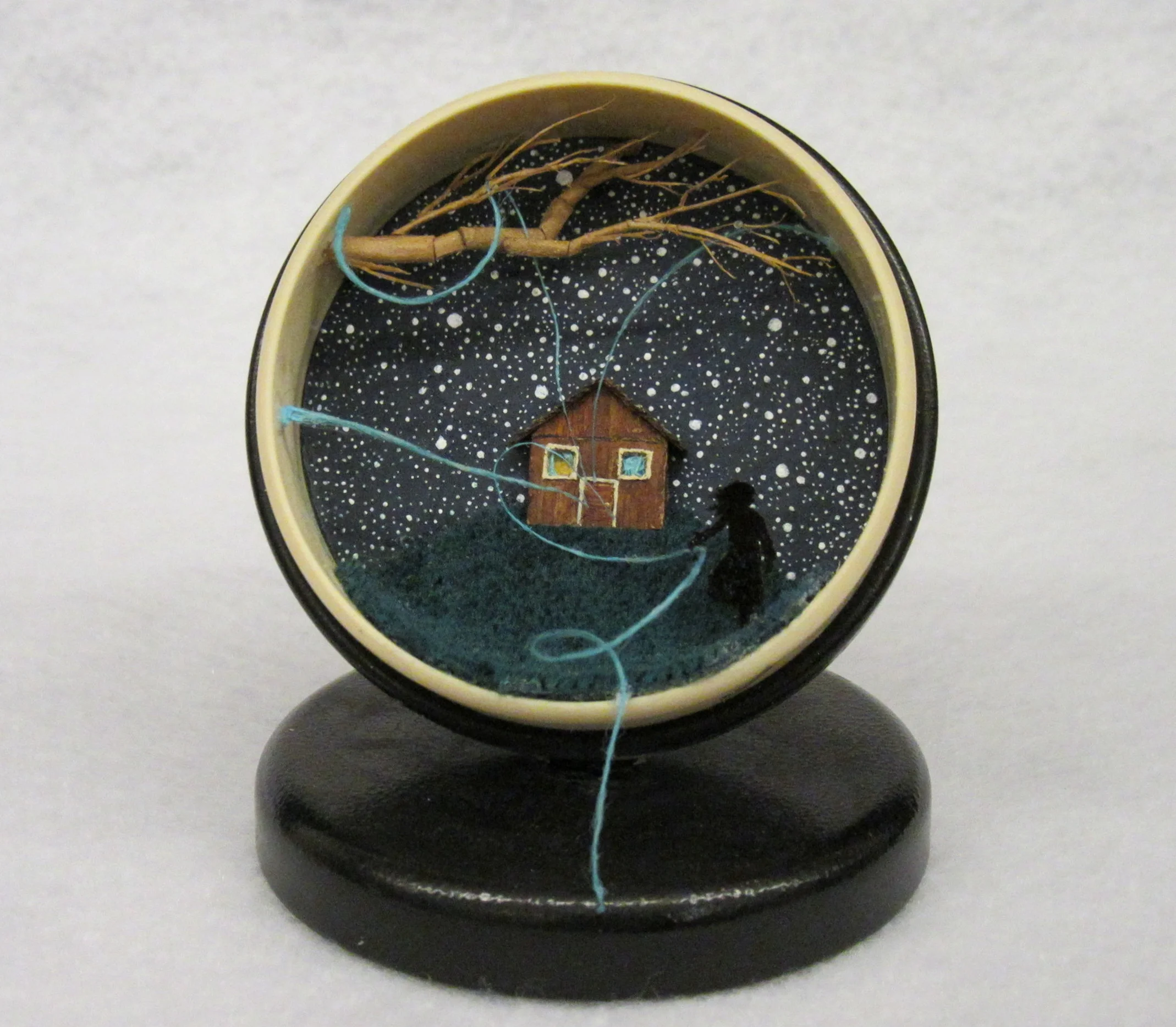Materials: The tree is made from cardboard and tissue paper and the painted backdrop is done with acrylic paint. The figure is polymer clay covered with acrylic paint and tissue paper and the grass is fabric.